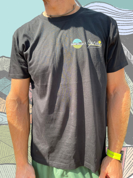 Abbiamo disegnato una t-shirt che racconta la collaborazione tra Jump Valley e Skimuniti, un e-commerce ed una associazione sportiva.